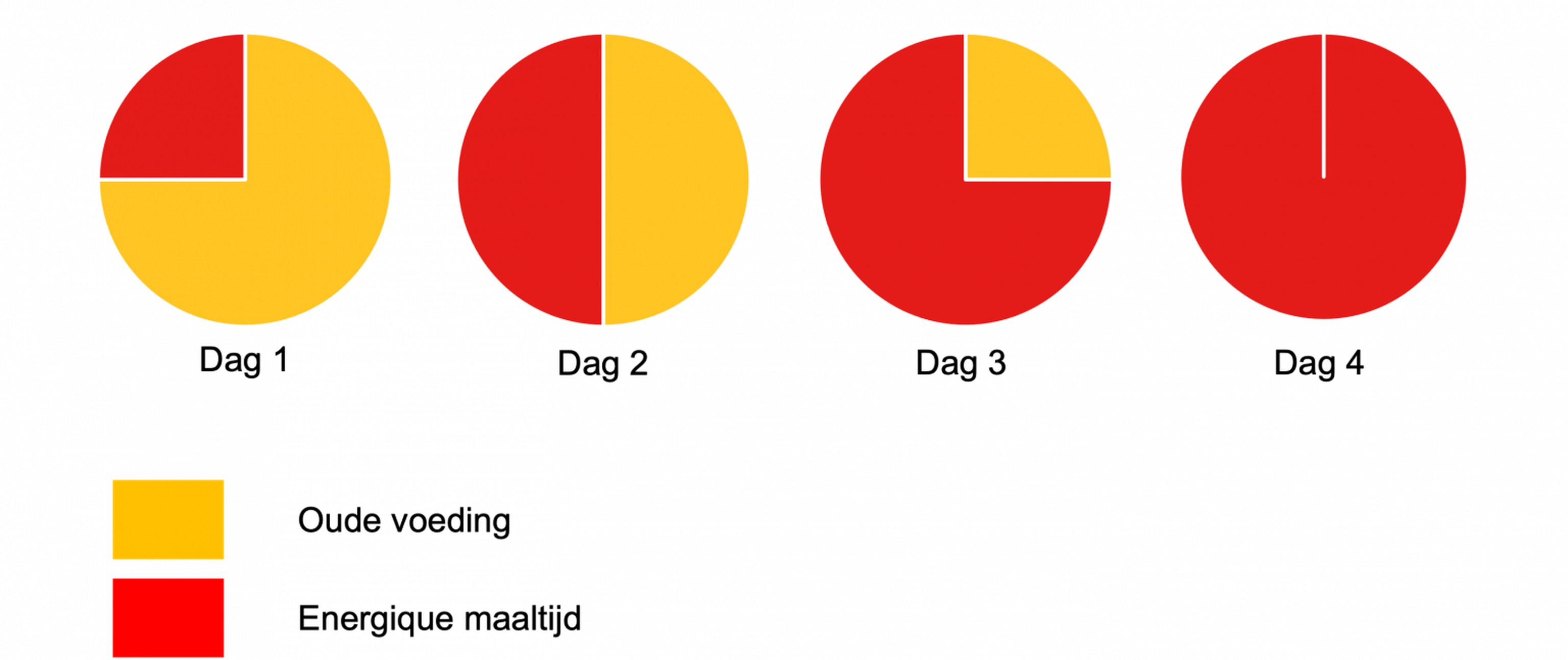 Wanneer je overschakelt naar een van onze maaltijden adviseren we je om gedurende enkele dagen de oude voeding stapsgewijs te verminderen en te vervangen door de Energique maaltijd naar keuze. Het beste kun je dan iedere dag een kwart van de oude voeding vervangen voor Energique. Energique kan prima gemengd worden met de oude voeding. Zelfs wanneer de oude voeding een brok is. Wanneer je hond of kat een gevoelig maag-darmkanaal heeft, is het raadzaam iets meer tijd voor de overstap te nemen. In dat geval adviseren we om in stappen van 10% per dag de oude voeding te vervangen door de Energique maaltijd. Na 10 dagen eet jouw hond of kat dan alleen nog Energique.