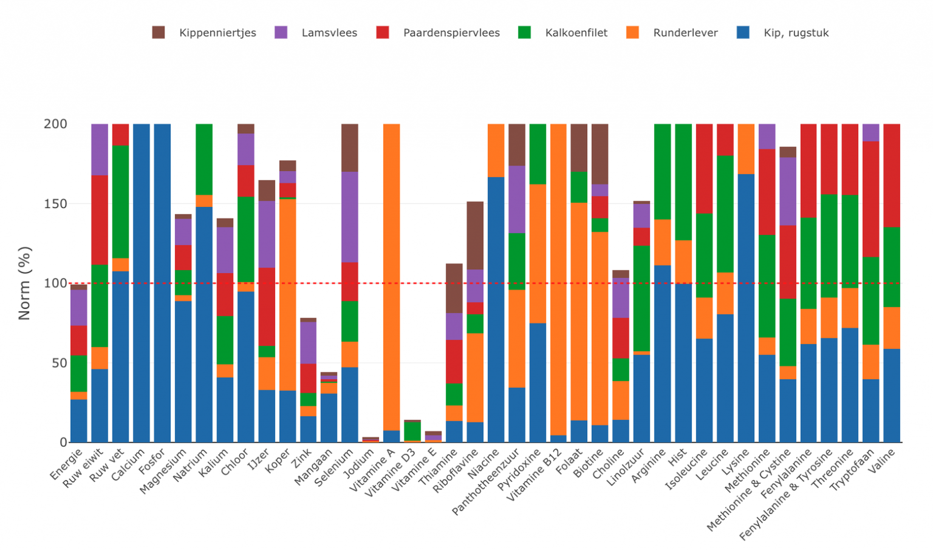 Bovenstaande figuur laat de nutritionele samenstelling zien van een maaltijd met enkele in BARF gebruikte ingrediënten en diersoorten, waaronder bevleesd bot, orgaanvlees en spiervlees. De rode stippellijn geeft hier de normlijn weer die benodigd is om de dagelijkse behoefte aan voedingsstoffen en energie voor een hond af te dekken. Hieruit valt op te maken er verschillende vitaminen en sporenelementen in veel te lage gehalten aanwezig zijn om in de behoefte van de hond te voorzien, ondanks afwisseling van verschillende vlees- en diersoorten. Voor een dagelijks volwaardige maaltijd dienen deze dus te worden aangevuld.