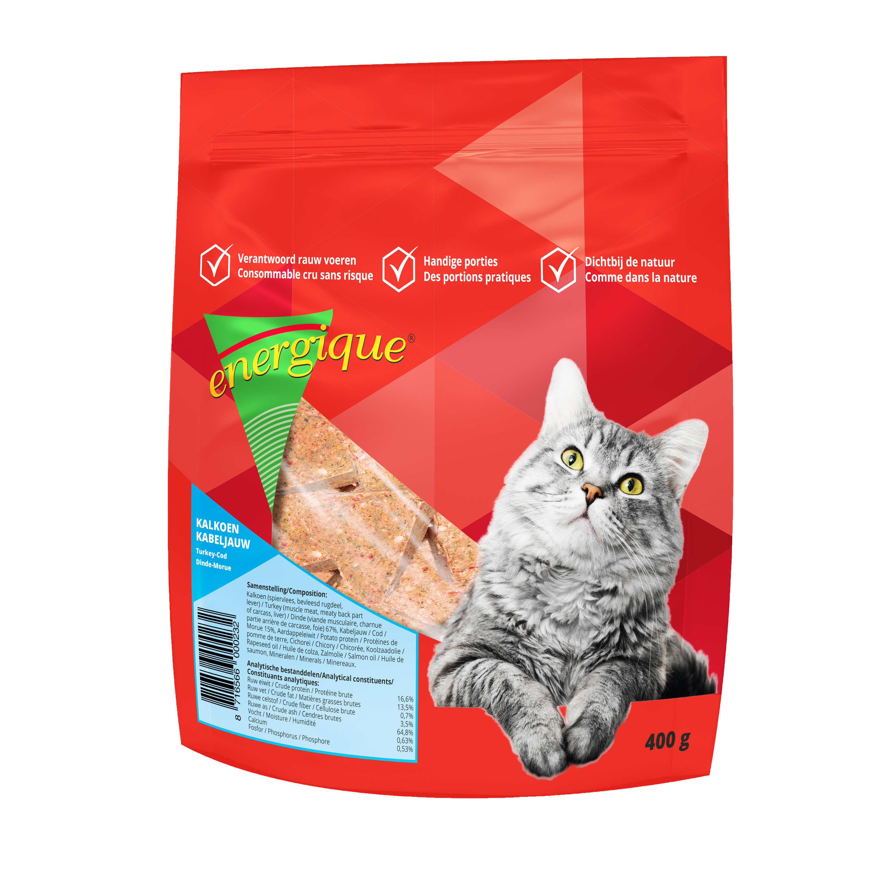 Energique Kat Kalkoen-Kabeljauw is een samengestelde maaltijd op basis van rauw vlees en verse vis die volledig voorziet in de dagelijkse behoefte van jouw kat.